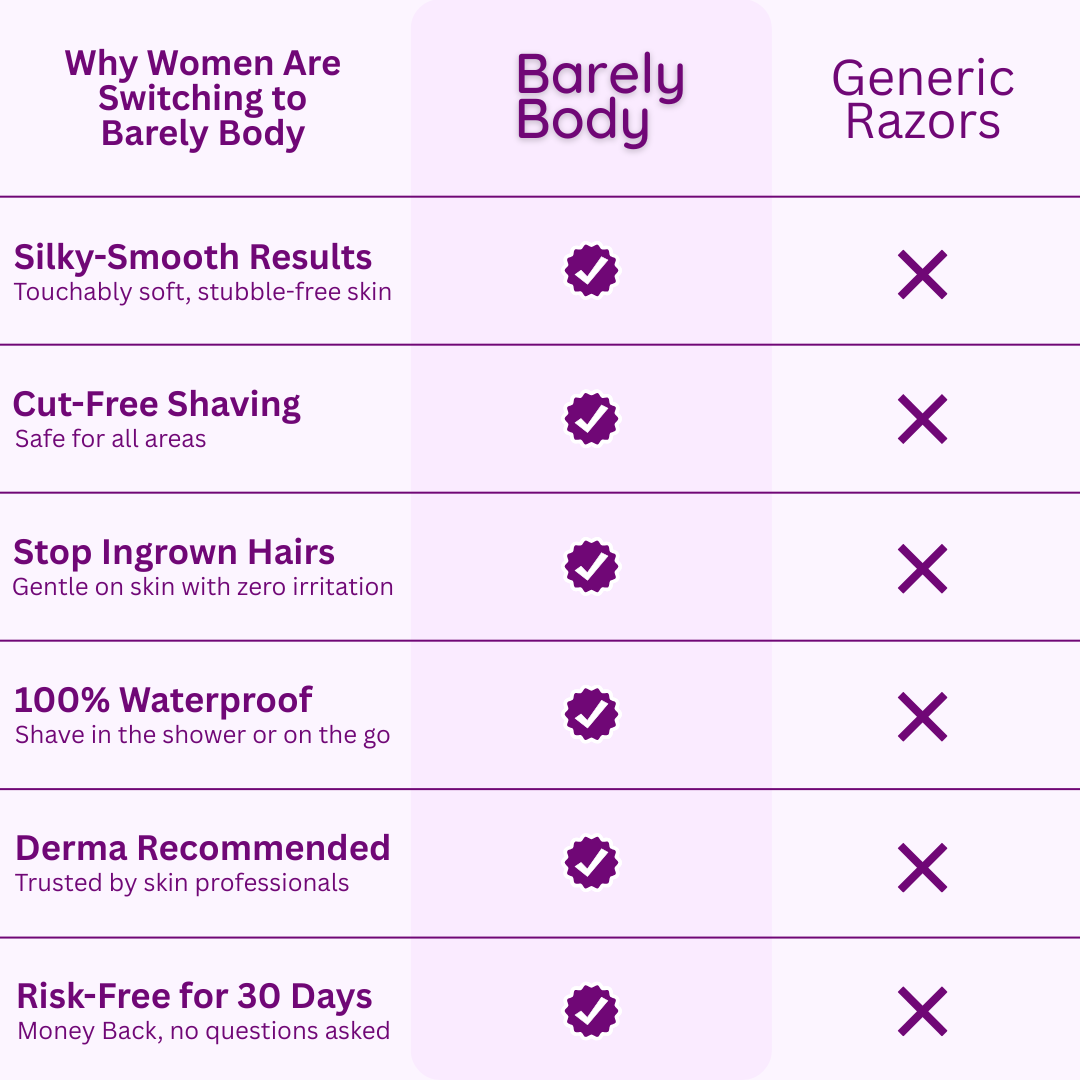 Barely Body delivers smooth, irritation free results where generic razors fall short. From cut-free shaving to waterproof convenience, we’ve redefined what a shave should feel like gentle, effective, and completely stress free. Once you switch, you won’t go back.